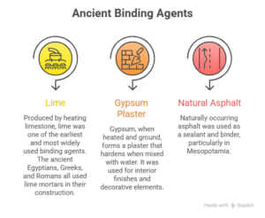 Lime: Produced by heating limestone, lime was one of the earliest and most widely used binding agents. The ancient Egyptians, Greeks, and Romans all used lime mortars in their construction.